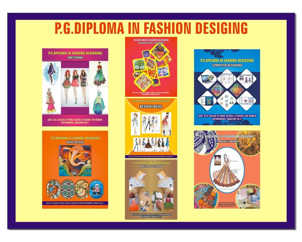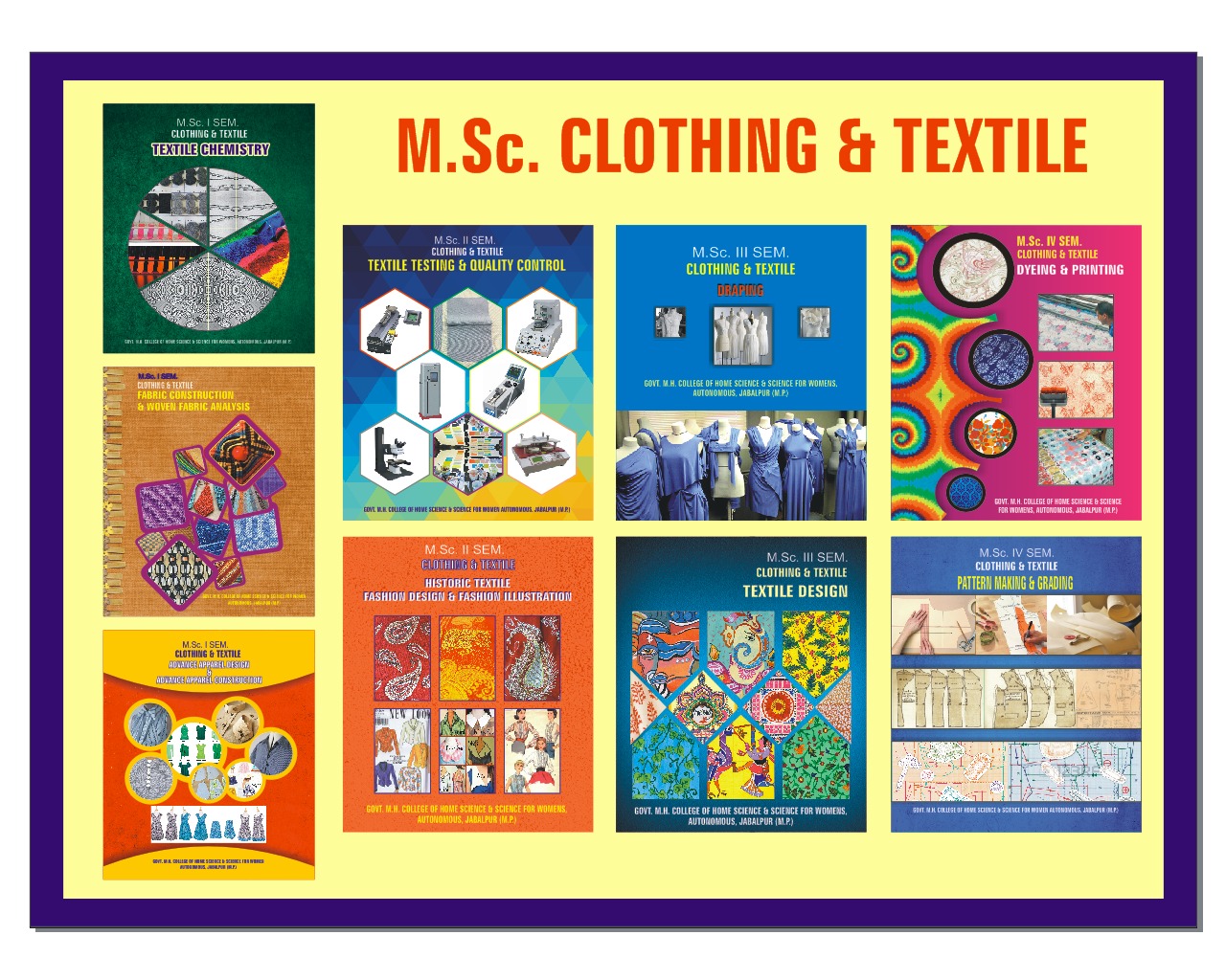 At PG level, To focus on the production distribution and consumer use of textiles and apprel.The detailed theoretical & practical knowledge of textile chemistry, fabric construction & woven fabric analysis, apparel design & advance apparel construction, textile testing & quality control, historic textile, fashion designing, research method, statistics & computer application, dyeing, printing, knitting technology, fashion retailing, social& psychological aspects of clothing, historic costume, history of textile, fashion marketing & merchandising, garment production technology, pattern making, grading, draping, etc. is given to the students. Dissertation work is done by the students of the departments on various topics  related to their subject. Internship is also done by the students during which the students gain training of work performed in industries.